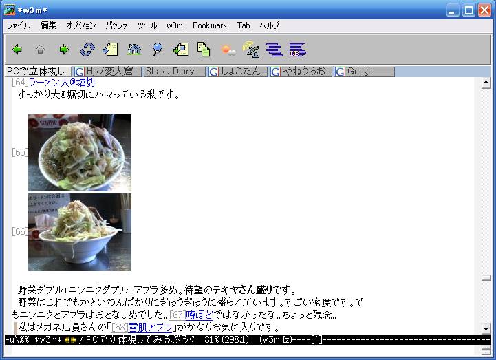 Meadow(Emacs)はemacs-w3mというのを使うと、エディターの画面上でウェブブラウズができてしまうのです。エディターとブラウザを同じ操作系で一緒に使えてしまいます。マウスは一切不要でブラウザからエディターへのコピー&ペーストがほえっとできちゃったりします。これは気持ちいいですよ。