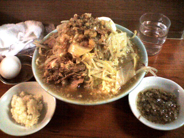 麺固めの麺少なめでブタ追加、野菜アブラ増し+生卵+国産ニンニク。