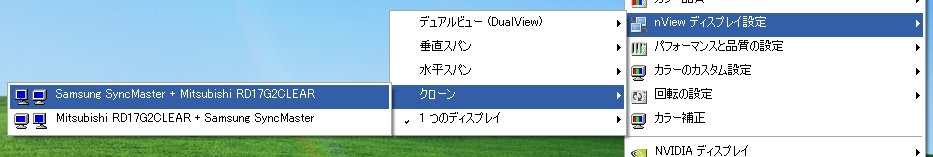 ・ 「nView ディスプレイ設定」でクローンを選択。z800側(我が家の例では:Mitsubishi RD17G2CLEAR)がセカンダリになる様に設定する。