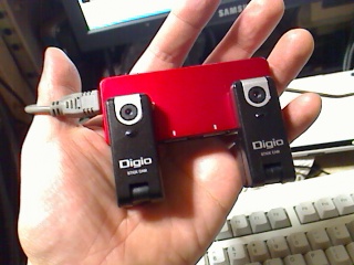 手持ちのUSBハブにかちっと付けて、ステレオカメラの完成。このUSBハブだとステレオベースがちょっと狭いけど。