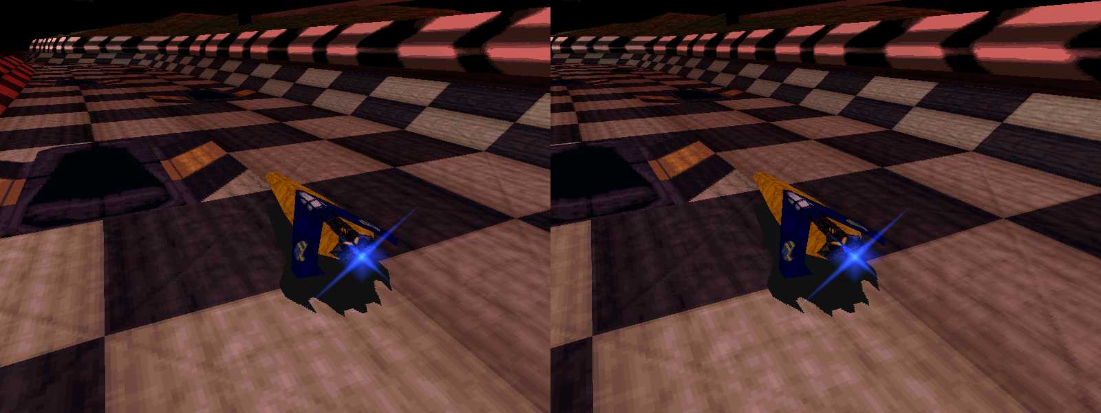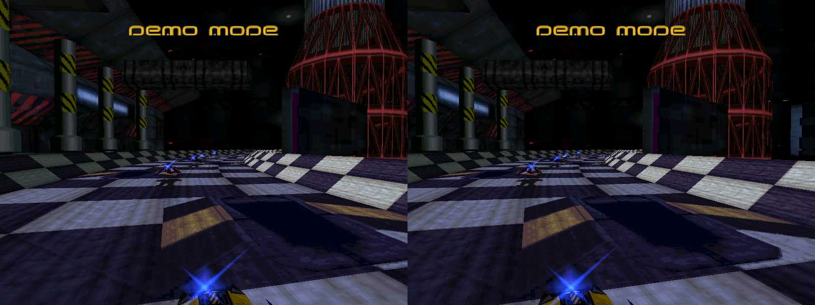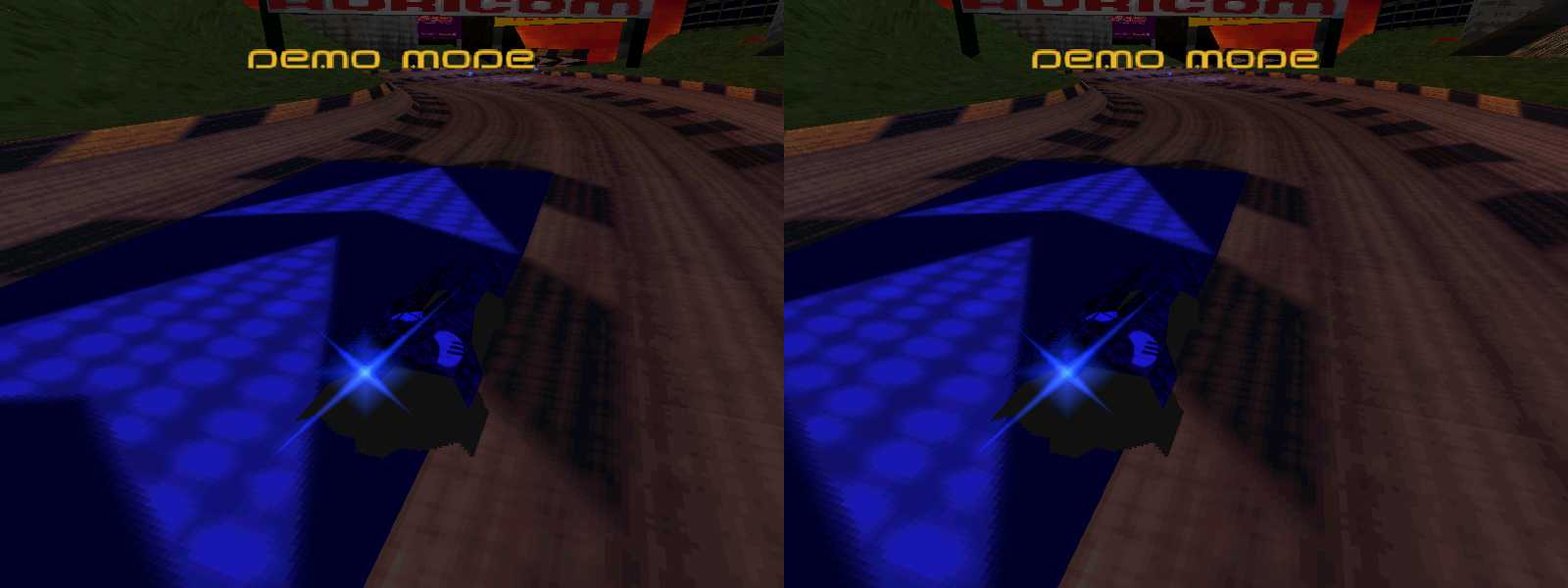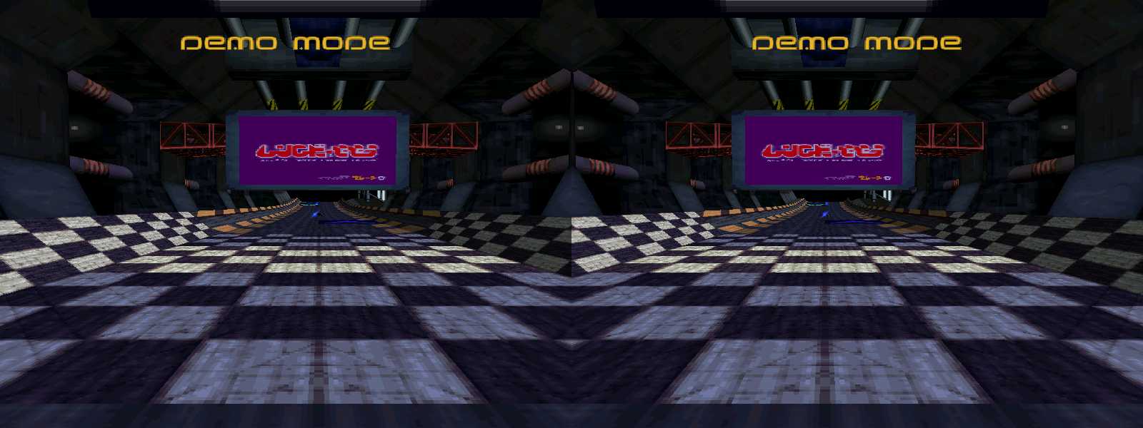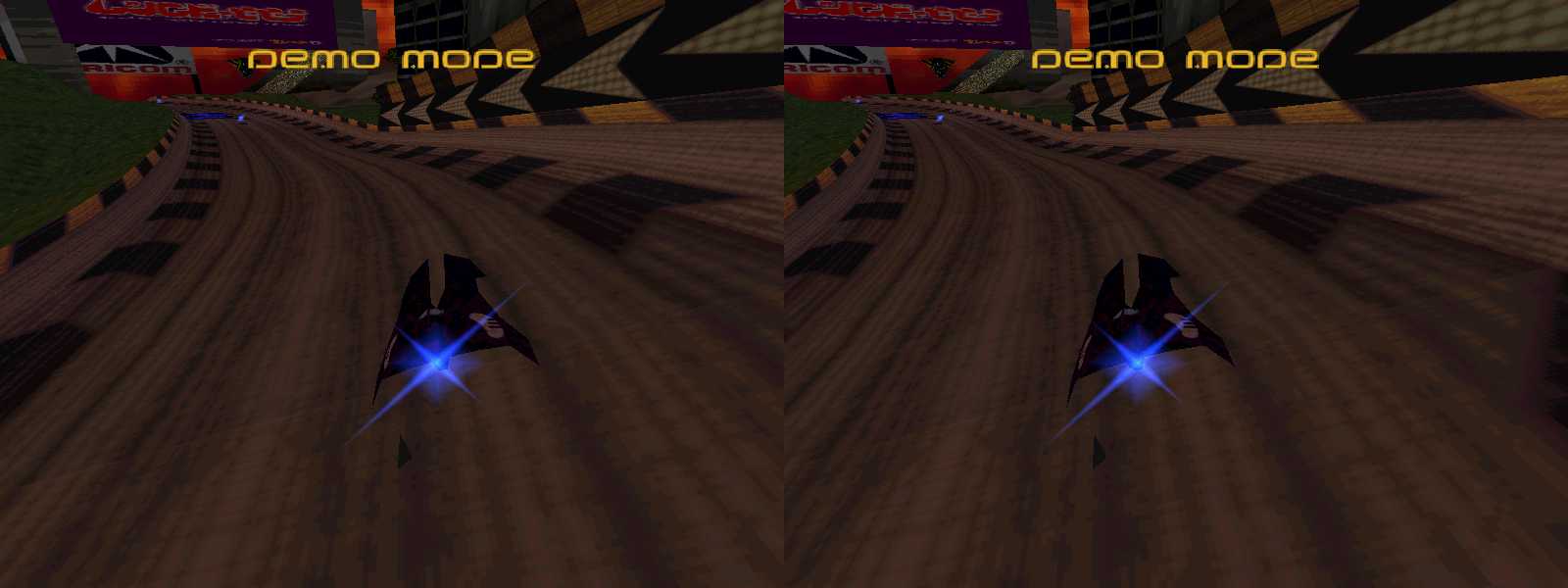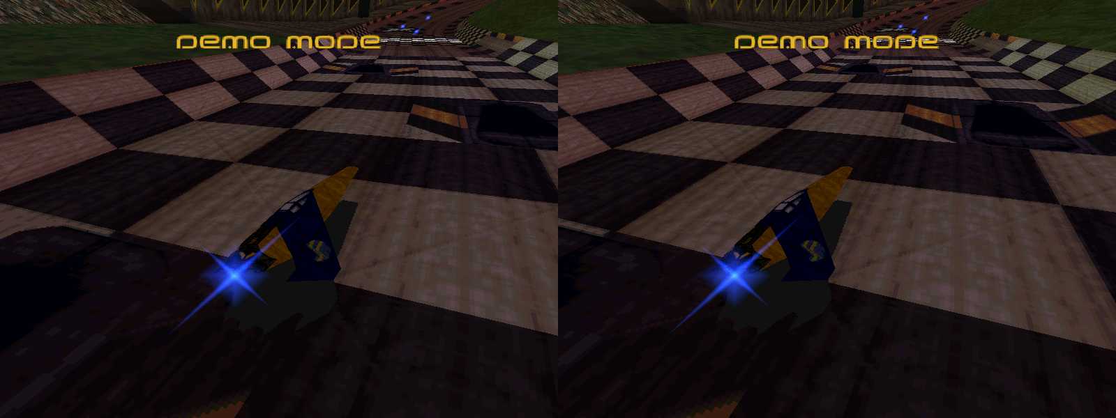ふた昔も前のゲーム(タイムスタンプがもろ10年前)ですが、解像度800x600に設定可能です。設定してしまえば後はずっと800x600で固定なので、z800でもまったく問題無しです。コース周りのオブジェはなんか怪しい立体感ですが、他はいい感じで立体視可能です。