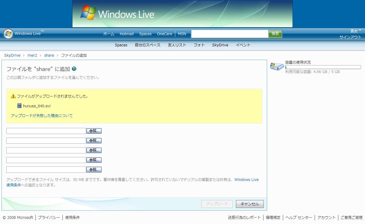 ちょっ、Windows Live SkyDriveはアップロード制限がありやがんの。50MB以上のファイルをアップロードすると、さんざん待たされたあげくに犯罪者扱いされるぞ。サンプルという意味でロスレスなFastCodec動画をそのままアップしようとしてたのに。という訳で、FastCodecでエンコードしたのをAviUtl+ffdshowでH264に変換した動画です。