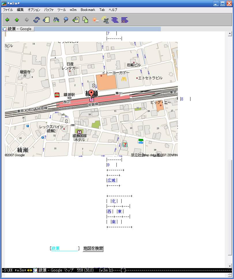 Meadow(Emacs)はemacs-w3mというのを使うと、エディターの画面上でウェブブラウズができてしまうのです。エディターとブラウザを同じ操作系で一緒に使えてしまいます。マウスは一切不要でブラウザからエディターへのコピー&ペーストがほえっとできちゃったりします。これは気持ちいいですよ。