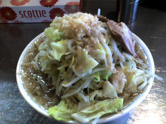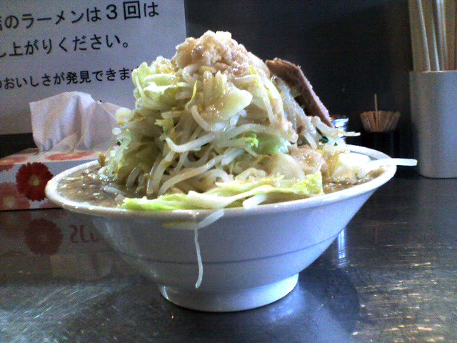 野菜はこれでもかといわんばかりにぎゅうぎゅうに盛られています。すごい密度です。でもニンニクとアブラはおとなしめでした。噂ほどではなかったな。ちょっと残念。