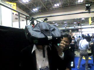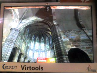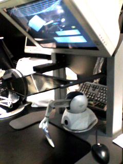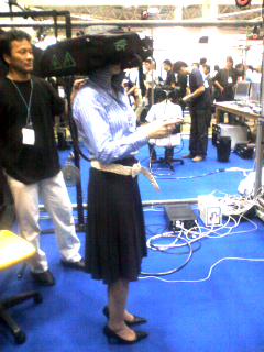 普通のタイプなHMDも展示されていました。あれ、写真撮ってないよ。このへんを参考にして下さい。展示されていたのは多分「NVISOR SX ヘッッドトラッカー内蔵型」。かかっていたデモは近未来風な駅のプラットホームをぶらぶらできるデモ。時々電車が通り過ぎたりする。以前どこかで見た事が有る。はっきり言ってあんまり面白くないデモだ。係員さんにもっとなんかないの?と聞いてみたら、違うデモを見せてくれた。