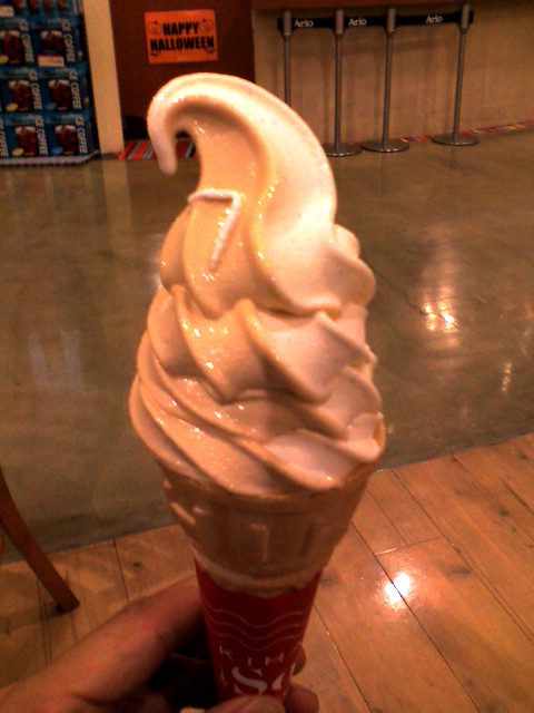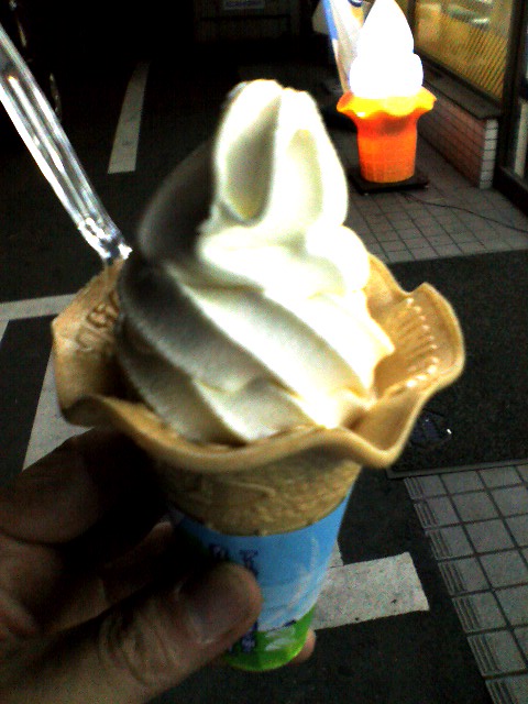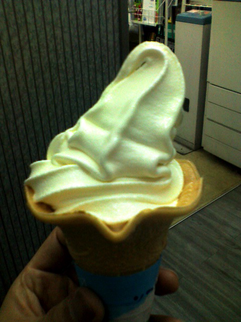そんなの邪道だよ、と思う向きもあるかもしれないが、これはこれで味わいがあってよろしい。いろんな種類の味を、常に一定の品質で供給できるのは店にとっても客にとってもかなりのメリットである。写真のような芸術品に会えたりする事もあるが(デイリーストアは芸術品に遭遇できる確率がかなり高い)。店によっては冷凍パックとコーンをセットするだけで自動で絞り出してくれる機械を置いてあるところもある(サンクスで目撃)。
