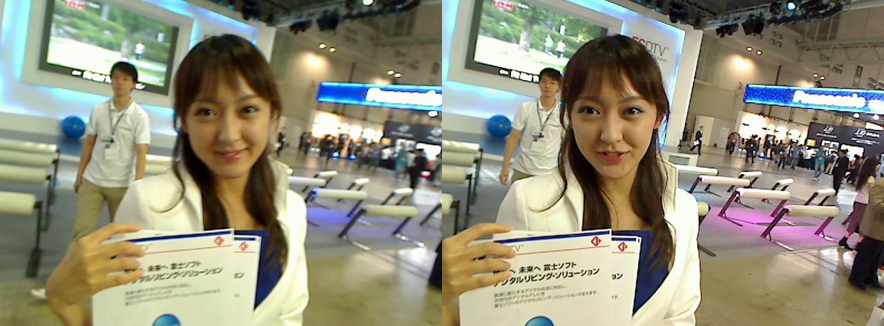 立体視ディスプレイの撮影を終えた頃、残り時間が一時間を切った。もう展示を廻るのもなんだから、コンパニオン3D撮影に挑戦してみることにした。したけど…すぐ飽きた。あんまりこういうの向いてないみたい。