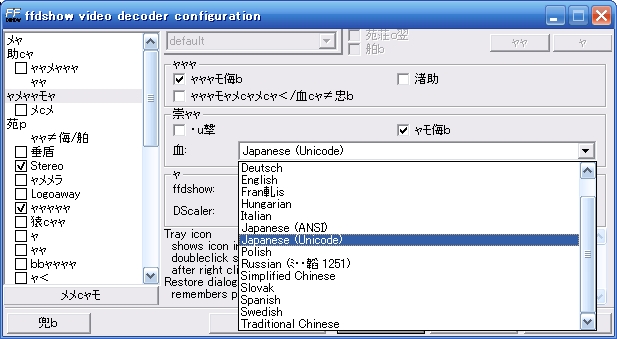しかし、最初は文字化けして表示されたのでかなり焦りました。出現した"ffdshow video decoder configuration"の窓、左側フレームの上から5行目をクリックして、右側のフレームの