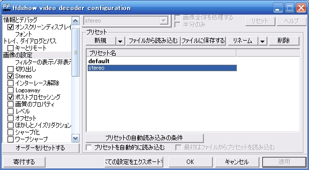 ・ プリセット名"stereo"をダブルクリックすると、プリセット名が強調表示になります。これで"stereo"の設定が動画再生の時の標準設定になります。