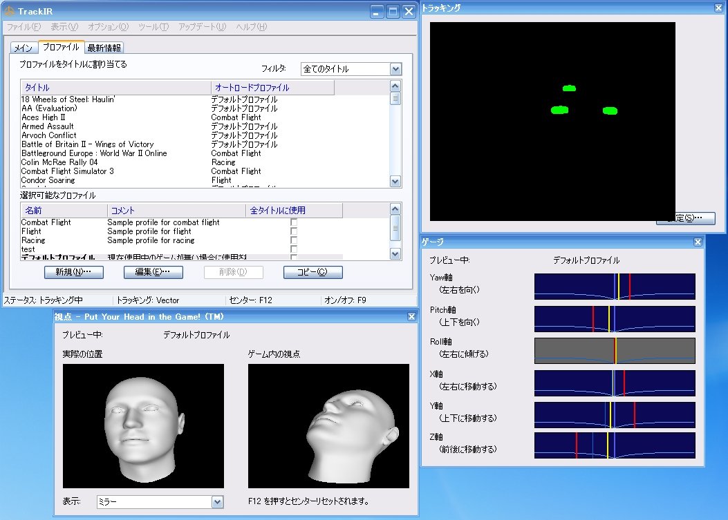 「トラッキング」の窓には、TrackIR本体が認識したTrackClipの反射板がリアルタイムで表示されます。「視点」の窓の3Dモデルと「ゲージ」の窓の各パラメータが、それに合わせてぐりぐり動きます。なかなかサイバーです。