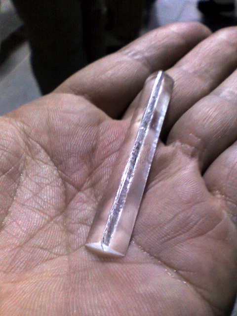 三角柱なアクリル棒を二つ、間に銀紙(アルミホイルだっけか?)を挟んで接着したもの。できたてのホヤホヤ。これをその場でQcam Pro for Notebooksにテープで固定して撮影してみたら、こうなった。