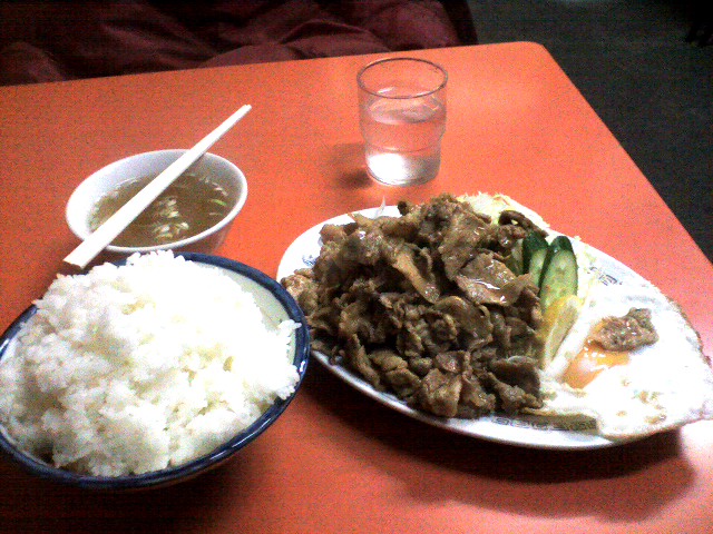食っても食っても無くならない大量の肉、味はしょっぱめ。それでもペース配分を誤ると、ごはんが余りそうになる。そして何故か目玉焼き。