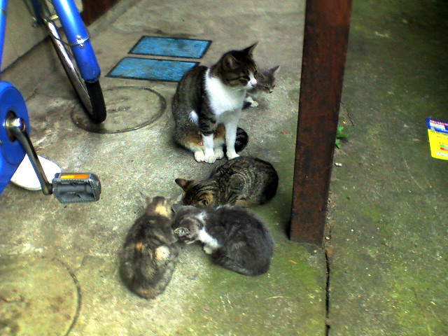生粋のノラ猫でいきなりこれはありえません。という訳で、この子猫たちは捨て猫であると判断しました。お母さんの下町猫人情ドラマ特性が子猫を見て再び発動してしまったようです。ぱっと見では誰がどう見ても親子猫です。でも全然計算が合わないの。