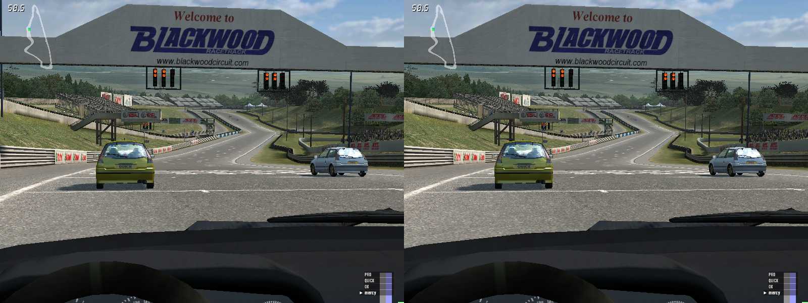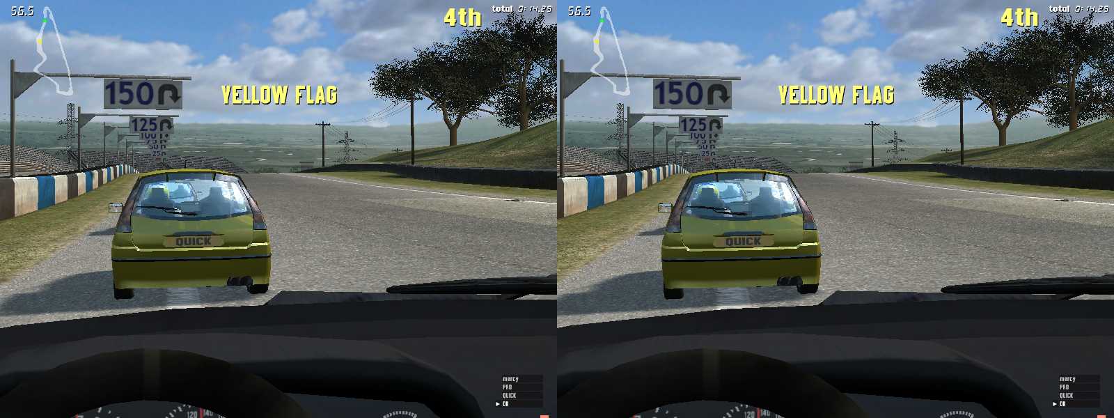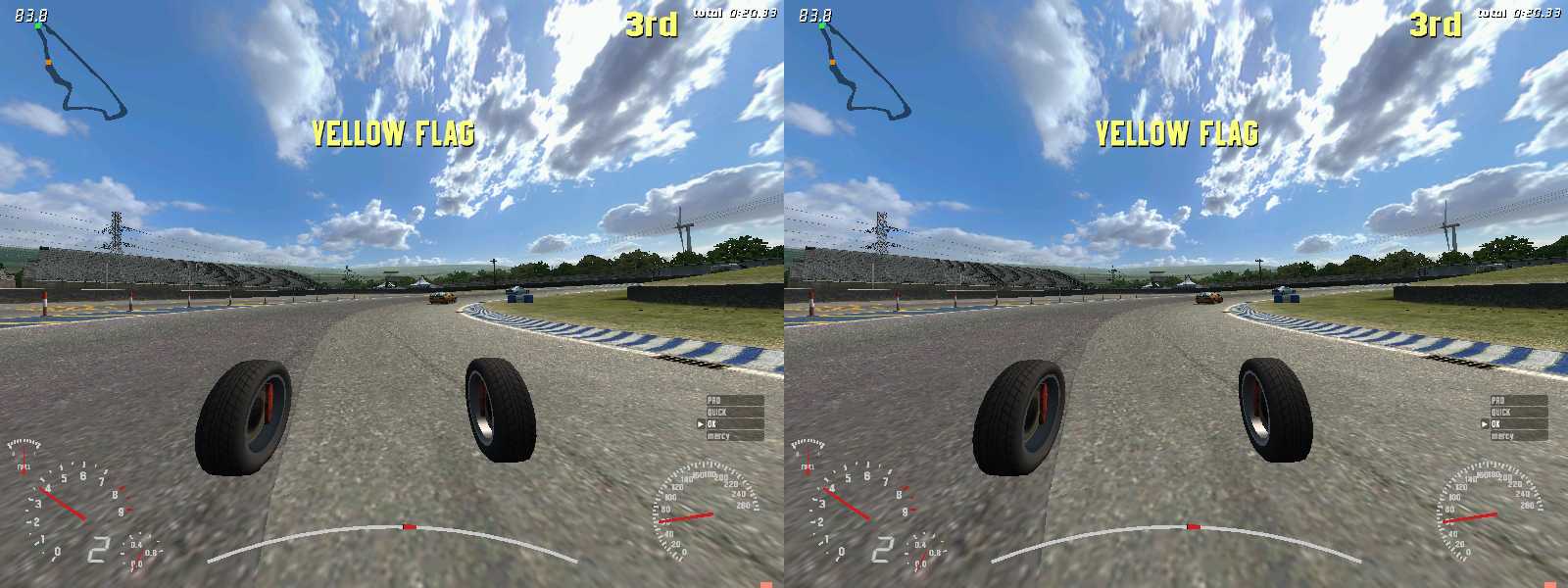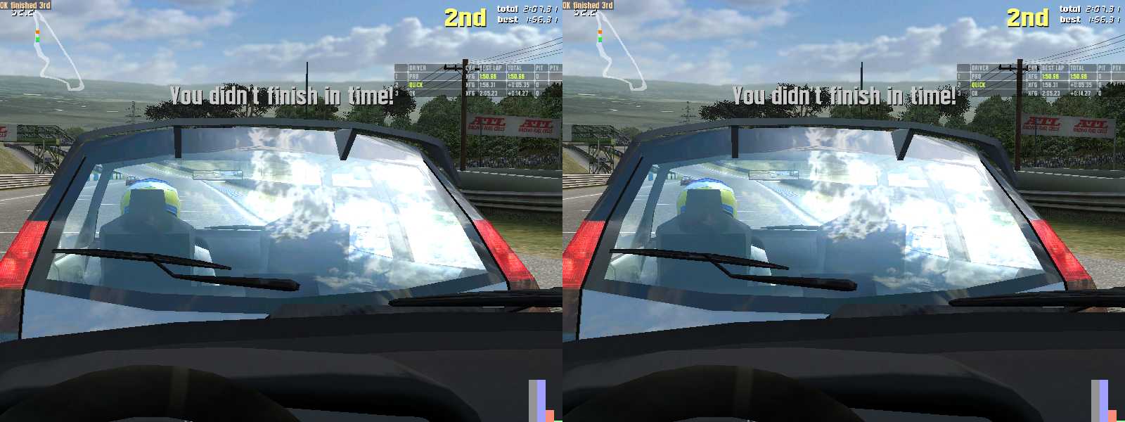 GTR2(デモ版)では振り向けるのは前方120°ぐらいでしたが、こちらは360°振り向けます。ギアをバックに入れて後ろを見ながらバックできます。ほとんど意味が無いけど感動です。窓から頭を出せないのが残念です。ただし、頻繁に振り向きをしていると、結構センターがずれます。センターがずれたらCtrl+Enterで現在向いている方向をセンターに再設定できますが、高速走行中にこれをやると確実に事故ります。注意。