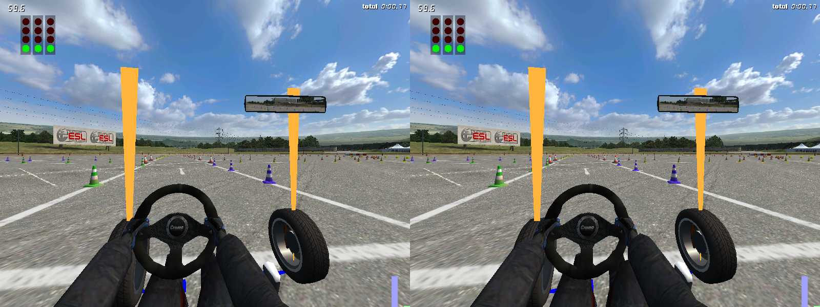 デフォルトではカメラ位置が引いた所にあって見晴らしがいいのであまり振り向き甲斐が無いのですが、5,6キーでカメラ位置を調整してカメラを寄った位置にするとかなり振り向き甲斐が出てきます。Training中にあるTestdriveというコースでは、振り向きで停車指定位置を探して、停車指定位置を注目しながら接近して、バックで車庫入れしてフィニッシュ、なんてことができます。気持ちいいです。